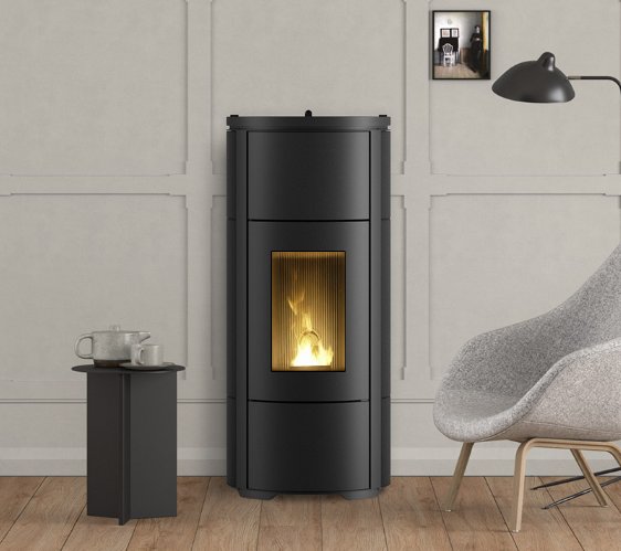 Poêle rond à granulés de bois en céramique, canalisable, d’une puissance de 10 kW.